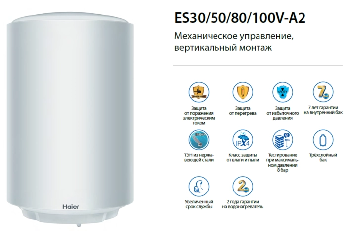 HAIER ES100V-A2 оснащен современными технологиями, такими как защита от перегрева и система автоматического отключения. Это обеспечивает безопасность и долговечность работы прибора. Антикоррозийное покрытие бака и магниевый анод защищают от образования накипи и коррозии, продлевая срок службы водонагревателя.