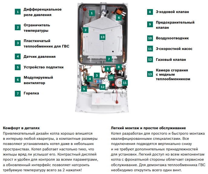 Оборудован 3-х скоростным насосом Wilo.Тихий в работе (до 36 дБ).Защищен от замерзания.Защищён от перепадов напряжения в диапазоне 165-255 Вт.Первичный теплообменник из чистой меди, без примесей, для долговечной и эффективной работы.Удобный и современный дисплей регулировки котла.Встроенная функция "зима-лето", которая помогает экономить газ в зависимости от погоды на улице.Немецкое качество.Компактные размеры, привлекательный дизайн и высокие стандарты качества Bosch нашли воплощение в настенном газовом котле, разработанном специально для поквартирного отопления. Широкий диапазон модуляции и возможность выбора котла с номинальной мощностью на отопление 12 или 24 кВт позволяют подобрать оптимальный вариант для жилых помещений площадью до 240 м².Подогрев воды для нужд ГВС проточым способом в отдельном пластинчатом теплообменнике обеспечивает быструю подачу воды требуемой температуры и высокий уровень комфорта всем пользователям.Привлекательный дизайн котла хорошо впишется в интерьер любой кваритры, а компактные размеры позволяют устанавливать котел даже в небольших пространствах. Котел работает настолько тихо, что жильцы вряд ли услышат его. Контрастный дисплей прост и удобен для контроля за всеми параметрами, а обновленный интерфейс позволяет настроить требуемую температуру всего за 2 нажатия!Все преимущества в одном абзацеГазовый настенный двухконтурный котел с номинальной мощностью до 24 кВтПластинчатый теплообменник для приготовления ГВССовременный дизайн и компактные размерыУдобный обновленный интерфейсВывод аварийного сигнала на пульт диспетчераВозможность подключения внешней автоматики On/Off