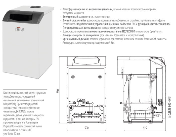 Технические характеристики Газовый котел с чугунным теплообменником FERROLI PEGASUS D 45 от БелЭлектроТоп - продажа и установка отопительного оборудования