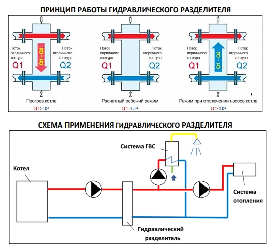Гидравлический разделитель позволяет исключить влияние насосов каждого контура друг на друга при различных режимах работы систем.