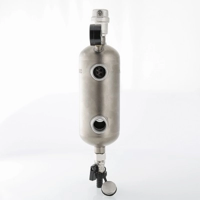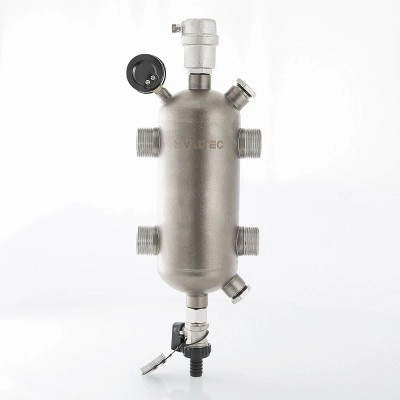 Гидравлический отделитель VALTEC (VT.VAR05.SS)(VT.VAR05.SS) Гидравлический распределитель (гидравлическая стрелка) VT.VAR05.SS изготовлен из нержавеющей стали марки AISI 304. Это обеспечивает меньшую стоимость аппарата, по сравнению с бронзовым, при высокой коррозионной стойкости и прочности.Конструкторы VALTEC дополнили гидрострелку спиральным сепаратором, интенсифицирующим отделение воздуха из теплоносителя, а также разделительной перегородкой, снижающей теплопотери из-за конвекции рабочей среды. Оба элемента выполнены перфорированными, из нержавеющей стали.Гидравлическая стрелка из нержавеющей стали комплектуется манометром, дренажным клапаном, автоматическим воздухоотводчиком с отсекающим клапаном. На корпусе предусмотрены резьбовые патрубки для дополнительной установки датчика температуры, термометра, магнитного шламоуловителя. Патрубки заглушены резьбовыми пробками.Изделие предназначено для систем с рабочим давлением до 10 бар, температурой теплоносителя до 110 °С, с максимальной тепловой мощностью (при ΔТ = 20 °С) 120 (для модели 1") и 200 (1 1/4") кВт.