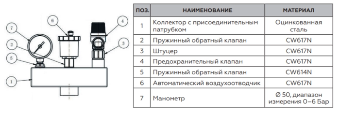 Технические характеристики Группа безопасности котла ROMMER RVS-0004-015025 3 бар, 1 (до 50 кВт) (без теплоизоляции)
