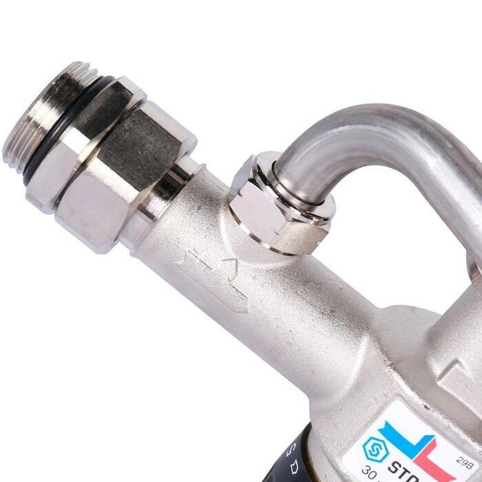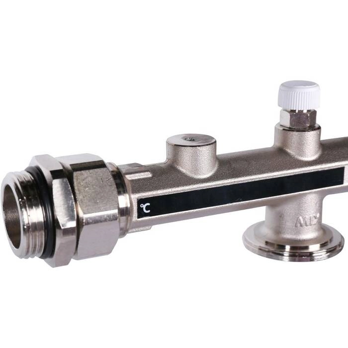 Насосно-смесительный узел с 3-х ходовым термостатическим клапаном оснащен встроенным термочувствительным жидкокристаллическим термометром, кристаллы которого меняют цвет при изменении температуры теплоносителя