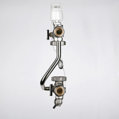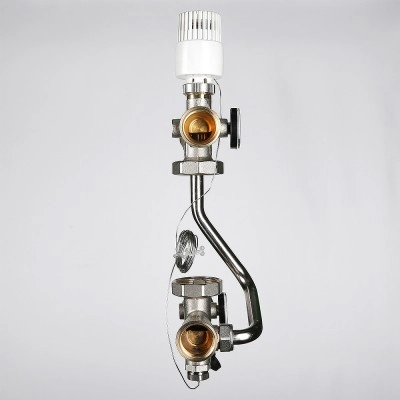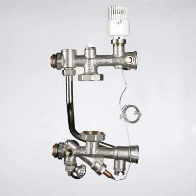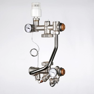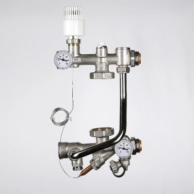 (VT.TECHNOMIX.0) Насосно-смесительный узел VALTEC TECHNOMIX предназначен для создания в системе отопления здания открытого циркуляционного контура с пониженной до настроечного значения температурой теплоносителя. Узел обеспечивает поддержание заданной температуры и расхода во вторичном циркуляционном контуре, а также позволяет регулировать температуру и расход теплоносителя в зависимости от требований пользователя.Насосно-смесительный узел TECHNOMIX используется, как правило, в системах встроенного обогрева (теплый пол, теплые стены, обогрев открытых площадок, теплиц и т.п.).Узел адаптирован для совместного применения с распределительными коллекторами петель теплого пола при межцентровом расстоянии между коллекторами 200 мм. Поставляется без циркуляционного насоса.Монтажная длина используемого насоса должна быть 130 мм (например, подойдут модели VRS 25/4G-130; VRS 25/6 G-130).Габариты смесительного узла позволяют располагать его в коллекторном шкафу VTc.541.D (глубиной 135 мм).Узел может быть установлен как слева, так и справа от обслуживаемого коллекторного блока.Тепломеханическая схема узла VT.TECHNOMIX:Обозначение на схеме: 1 – термостатический клапан; 2 – термоголовка с выносным датчиком или сервопривод (сервопривод в комплект поставки не входит); 3 – балансировочный клапан вторичного контура; 4 – балансировочный клапан первичного контура; 5 – термометр; 6 – дренажный кран; 7 – гильза для датчика температуры; 8 – накидные гайки для присоединения насоса в комплекте с прокладками; 9 – насос циркуляционный (в комплект поставки не входит); 10 – обратный клапан; 11 – ручной воздухоотводчик.VT.TECHNOMIX может работать от контроллера с погодозависимым управлением VT.К200.М. В этом случае вместо термоголовки с выносным датчиком на термостатический клапан устанавливается аналоговый электротермический сервопривод VT.TE3061.Насосно-смесительный узел VT.TECHNOMIX и все его комплектующие производятся в Италии.