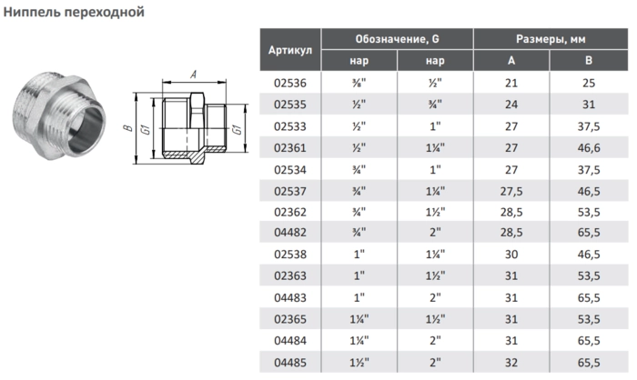 Технические характеристики Ниппель переходной нар/нар Aqualink