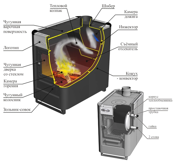 Печь-камин длительного горения Stoker «Садовый» предназначен для обогрева помещений объемом до 150 м3 c возможностью установки теплообменника с боковых сторон.Корпус печи со всех сторон закрыт конвектором, который усиливает конвективный эффект, что позволяет максимально быстро обогреть помещение.Для регулировки горения камина можно применять зольник, а в режиме длительного горения регулировка может производиться при помощи микрошиберов, находящихся в верхней и в нижней части дверцы.Печь-камин имеет большую и вместительную чугунную варочную поверхность, позволяющую готовить или разогревать пищу во время работы печи.Главные отличия и преимущества печи-камина Stoker «Садовый»:Режим длительного горения. Специальная конструкция топки с камерой дожига вторичных газов позволяет обеспечить длительное горение до 6 часов.Сложная система дымохода. Дополнительные отсекатели огня выполняет функцию оптимального распределения уходящих дымовых газов, исключая прямоток и обеспечивая полное сгорание топлива. Это повышает КПД и улучшает теплопередачу печи.Тонкая регулировка горения. Наличие специальных микрошиберов в дверце дают возможность дополнительной регулировки и выбора режимов горения.Большое термостойкое стекло 245х245 мм, с функцией самоочистки в процессе горения «Чистое стекло», создает уютную и комфортную атмосферу камина.Возможность установки теплообменника (опция) для подключения радиаторов отопления или нагрева воды в выносном баке.Другие особенности печи-камина «Садовый»:герметичная дверка топки с плотным запиранием и зольник - исключают бесконтрольный подсос воздуха в топку, обеспечивая стабильность и длительность горенияглубокая и большая топка для загрузки большого объема дров длиной до 50 см.система направленной конвекции. Кожух-конвектор печи-камина образует мощный конвективный поток для быстрого прогрева помещения, а также защищает от сильного инфракрасного излучения.дополнительный канал подачи воздуха в камеру дожига (инжектор)большая чугунная варочная поверхность с конфоркойпрочный сменный чугунный колосниксамоохлаждаемая ручкана ножках есть специальные отверстия, которые помогут закрепить печь к полу для надежности и сохранности.шибер дымохода в комплектеприсоединительный диаметр дымохода - 115 мм.увеличенный зольный совок позволяет производить очистку в процессе работы печиПечь-камин Stoker «Садовый» универсален и предназначен для обогрева хозяйственных и бытовых помещений, а также, разогрева или приготовления пищи. Камин относится к нагревательным устройствам конвекционного типа, работающим на твердом топливе (дрова).