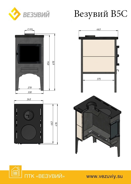Отопительная печь «Везувий» В5 предназначена для установки в различных хозяйственных помещениях небольшого размера, садовых домиках, жилых помещениях временного проживания. Печь изготовлена из особопрочной котловой стали марки 09Г2С.Верхнюю горизонтальную поверхность можно использовать для приготовления пищи. Печь укомплектована чугунным колосником и чугунной негерметичной дверцей Везувий ДТ-4. Печь облицована керамической плиткой для лучшего распределения тепла.Отопительная печь «Везувий» В5 способна отапливать помещения объемом до 100 м3.