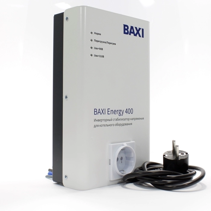 Инверторный стабилизатор для котельного оборудования BAXI ENERGY 400Идеальное синусоидальное выходное напряжение с высокой точностью стабилизации (± 2%) во всем допустимом диапазоне входного напряжения (90-310В);Встроенный накопитель энергии для компенсации кратковременных импульсных пропаданий входного напряжения (200 мс);Многоуровневая электронная аварийная защита с восстановлением в случаях: короткого замыкания, перегрузки, перегрева, аварии сети (напряжение входной сети свыше 90-310В);Коррекция формы входного напряжения (идеальная синусоида на выходе стабилизатора при любых искажениях в сети);Высокий КПД - до 97%;Низкий уровень шума, небольшой вес и габариты.