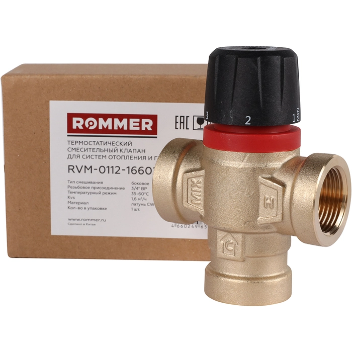 Технические характеристики Термостатический смесительный клапан ROMMER 3/4 ВР 35-60°C KV 1,6 от БелЭлектроТоп: продажа и установка отопительного оборудования