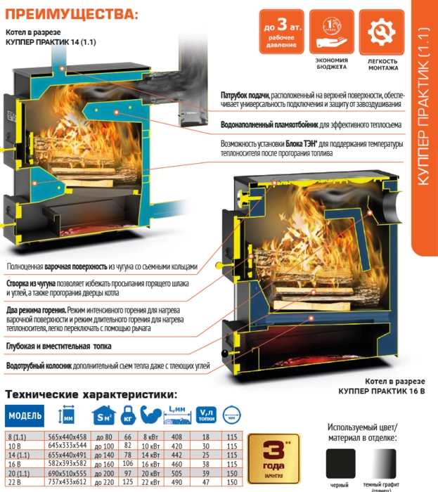 ТЕПЛОДАР «Куппер Практик» 14 1.1 отличается высокой энергоэффективностью и экономичностью. Благодаря продуманной конструкции и использованию качественных материалов, котел демонстрирует длительный срок службы и надежную работу даже в самых суровых условиях. Его мощность в 14 кВт позволяет эффективно отапливать помещения площадью до 140 м², обеспечивая равномерное распределение тепла.