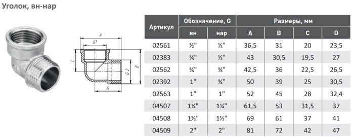 Технические характеристики Угольник Внутр/Нар Aqualink